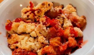 4. Disposez la rhubarbe et les fraises dans un plat allant au four puis recouvrir du crumble émietté. Enfournez pour une heure, et dégustez encore chaud !